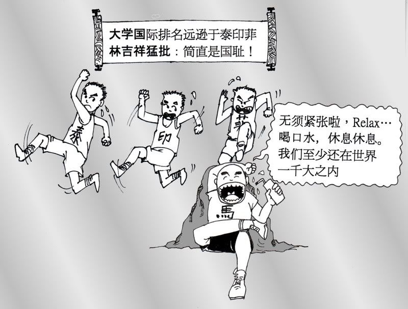 林吉祥表示,虽然政府把理科大学列为顶尖大学,但是理大在国际上的排名却很糟糕,除了在2004年获得第111名外,在2005年排名第326、2006年排名第277、2007年排名第307及今年排名第313。他说,双重可悲的是,身为我国尖顶大学的理大排名第313,在东南亚不只远不如新加坡(新加坡国大排名30及南大排名77),而且也不如泰国(朱拉隆功大学排名166)、印尼(印尼大学排名287)及菲律宾(马尼拉Ateneo大学排名254及菲律宾大学排名276)。“截至去年为止,大马的大学排名,仍比印尼的大学来得佳,但在今年的THES排名榜上,印尼大学的排名已经大跃进及超越了大马的大学。”